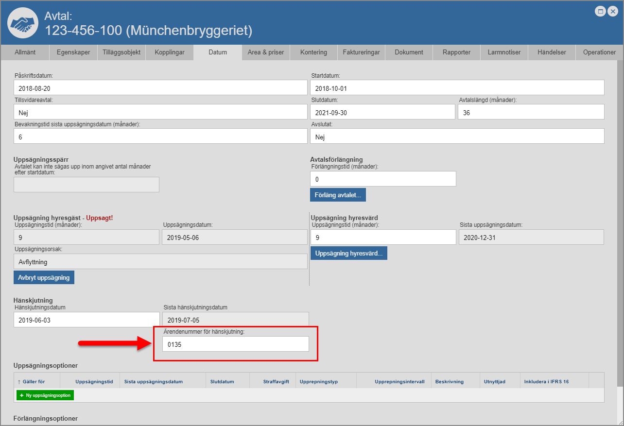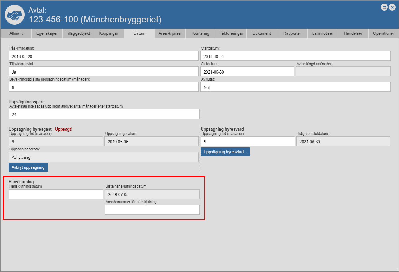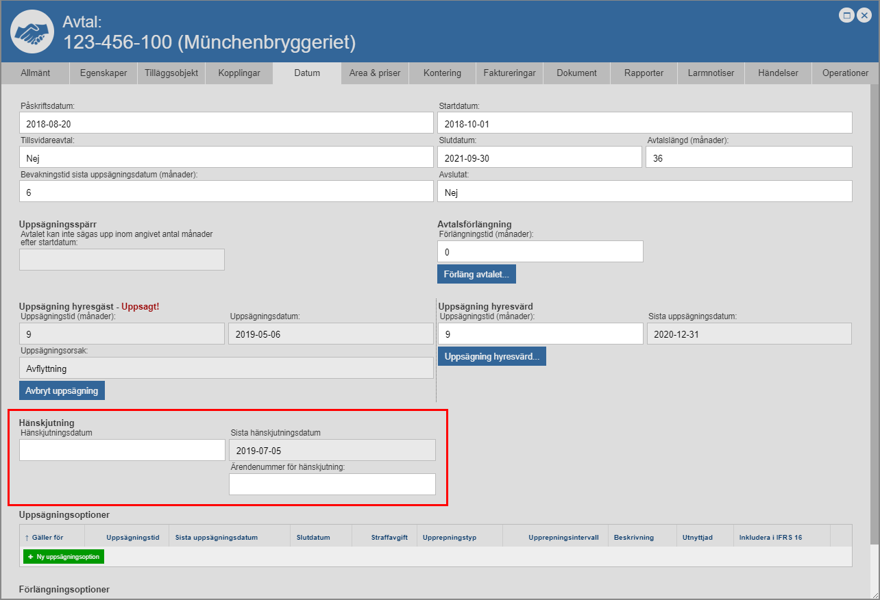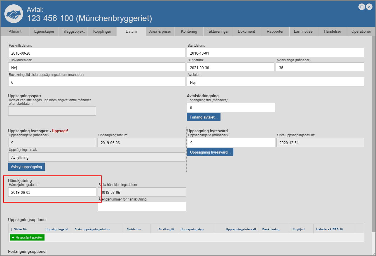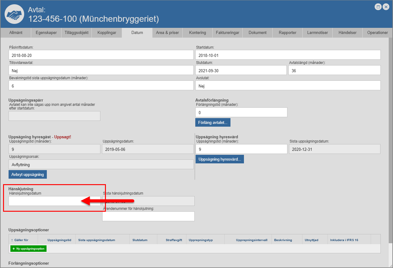 För att du ska kunna sätta ett häskjutningsdatum på det avtal du arbetar med måste minst en avtalspart vara uppsagd. Det är inte förrän en avtalspart har blivit uppsagd som möjligheten att sätta ett hänskjutningsdatum på ett avtal, presenterar sig.