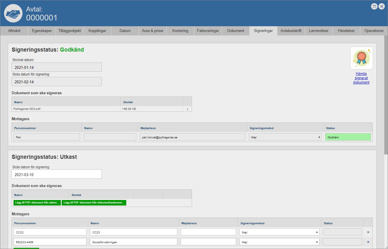 När du skapat en signering och klickat på knappen med namnet ”Skicka till signering” kan du se status på signeringen i avtalskortet. En signering kan antingen ha statusen "Skickad", "Godkänd" eller "Avböjd". Obs! Om du skapar en signering utan att klicka på knappen med namnet "Skicka till signering" kommer signeringen sparas som ett utkast i avtalskortet.