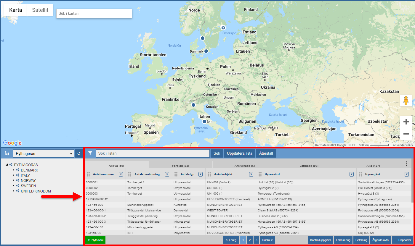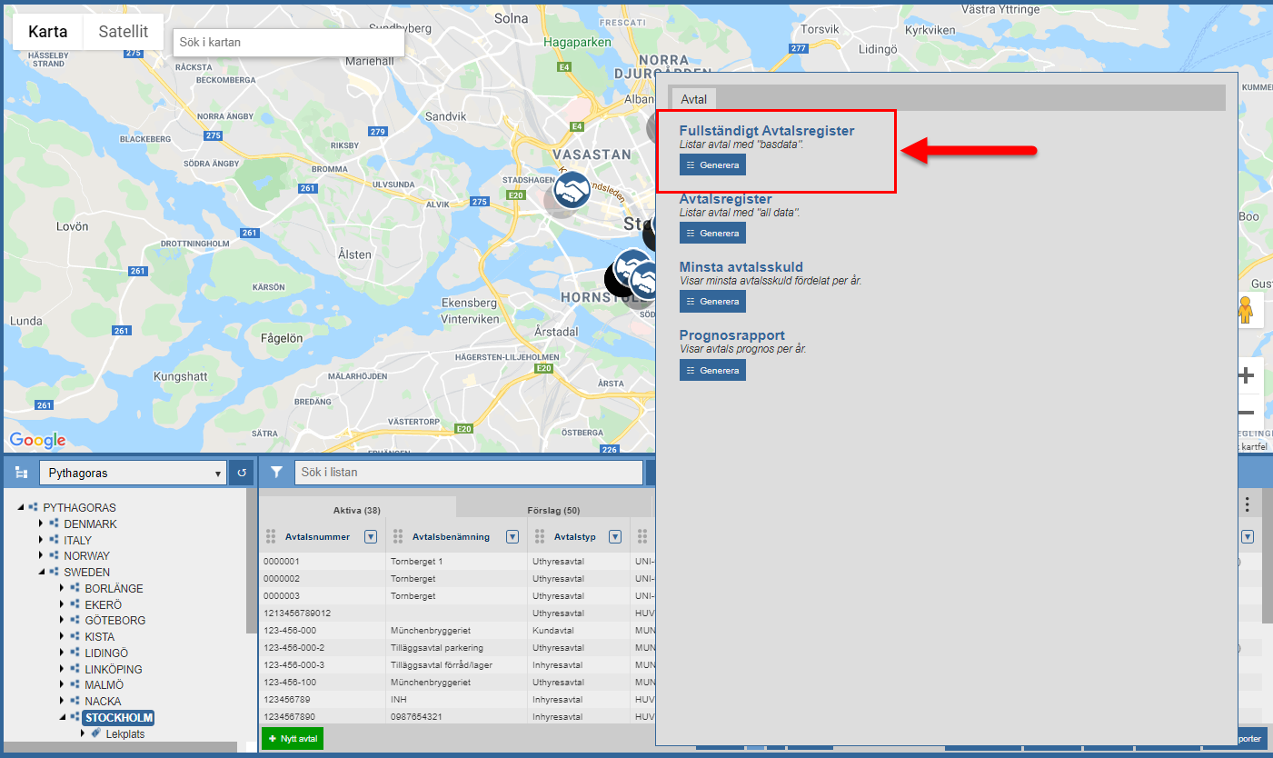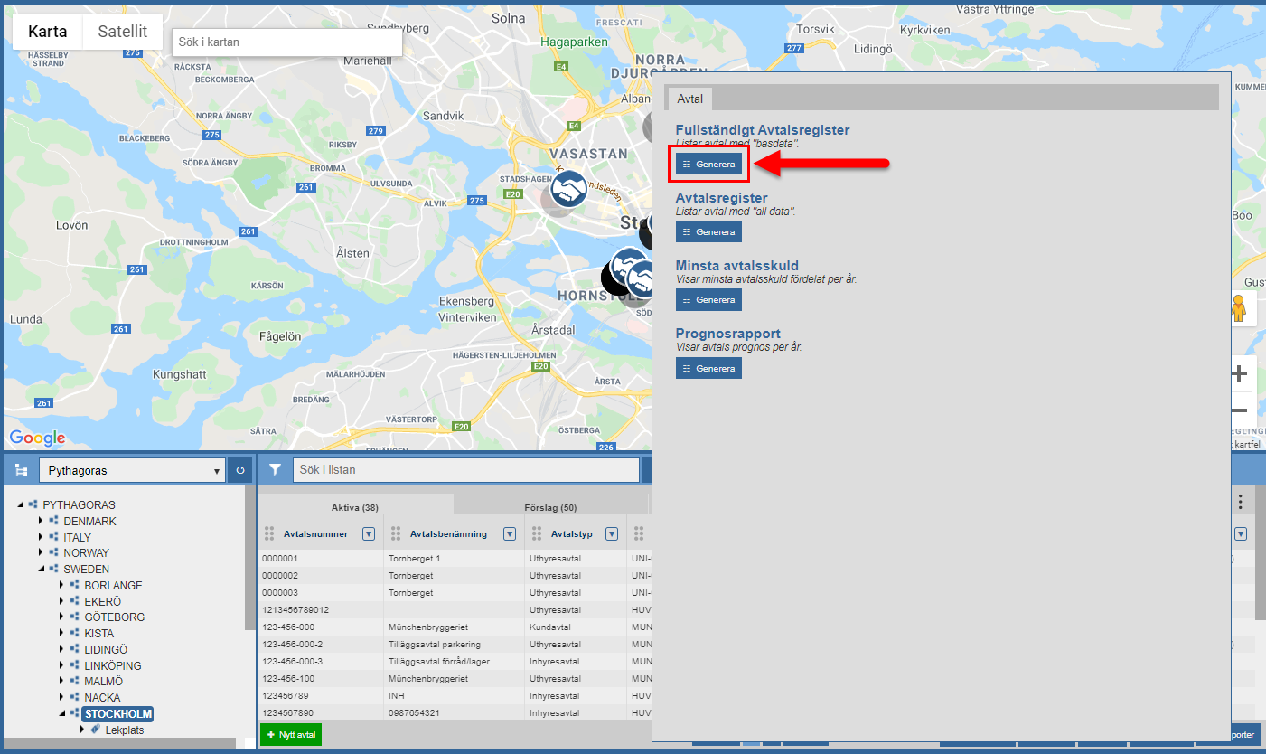 Se till att de avtal du vill inkludera i din rapport är tillgängliga i objektslistan. Detta genom att filtrera fram avtal i denna. För att filtrera fram avtal i objektslistan kan du använda dig av navigationsträdet, göra en fritextsökning eller filtrera i en kolumn. I bilden nedan ser du att vi använde oss av navigationsträdet för att filtrera fram avtal i objektslistan. För mer information om hur du använder dig av navigationsträdet för att filtrera fram avtal i objektslistan, se avsnitt 6.1. För mer information om hur du gör en fritextsökning i objektslistan, se avsnitt 6.4.1. För mer information om hur du filtrerar i en kolumn i objektslistan, se avsnitt 6.4.2.