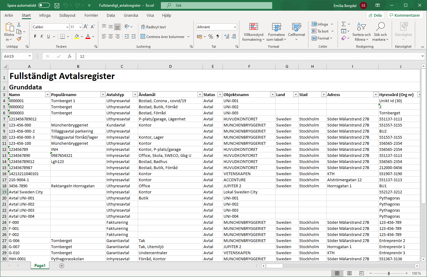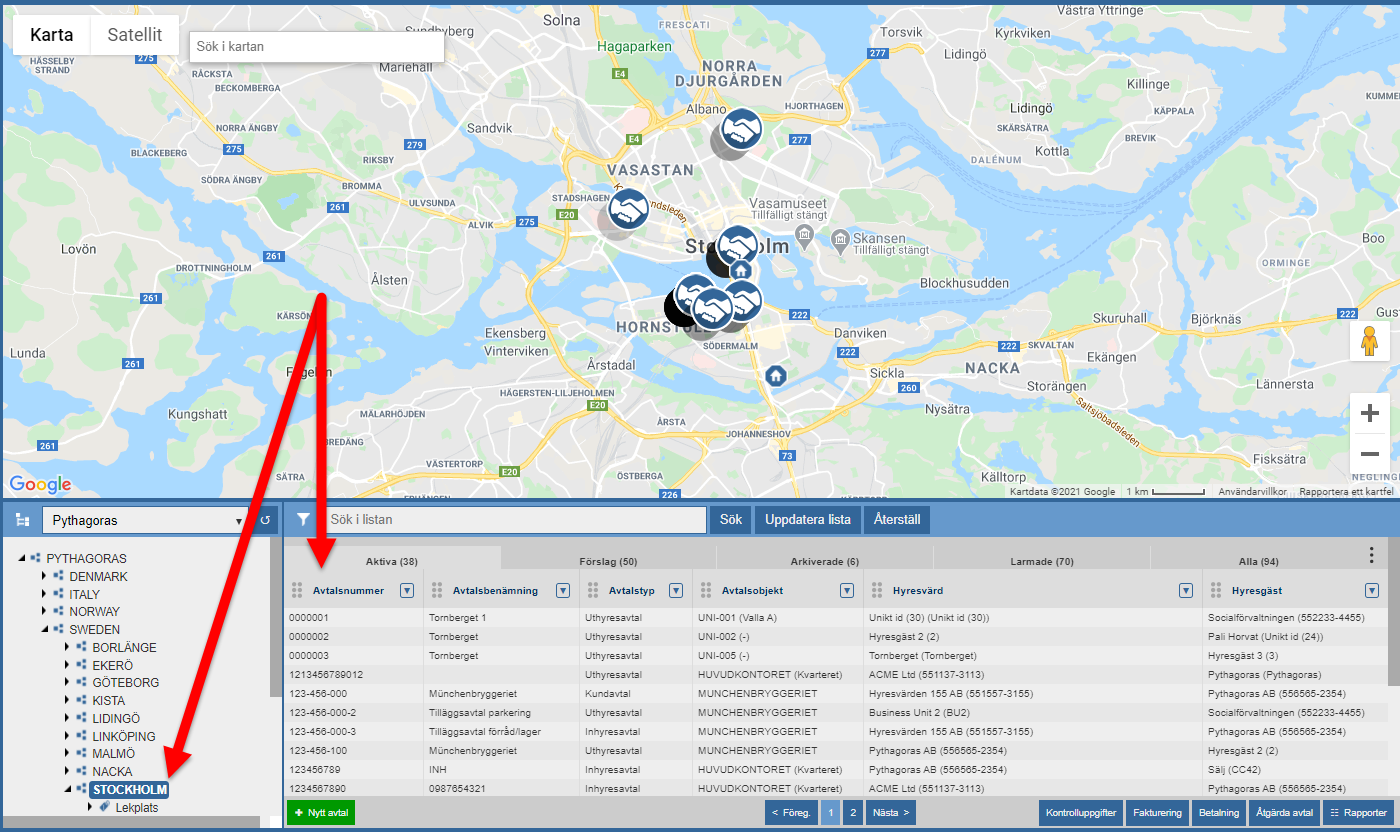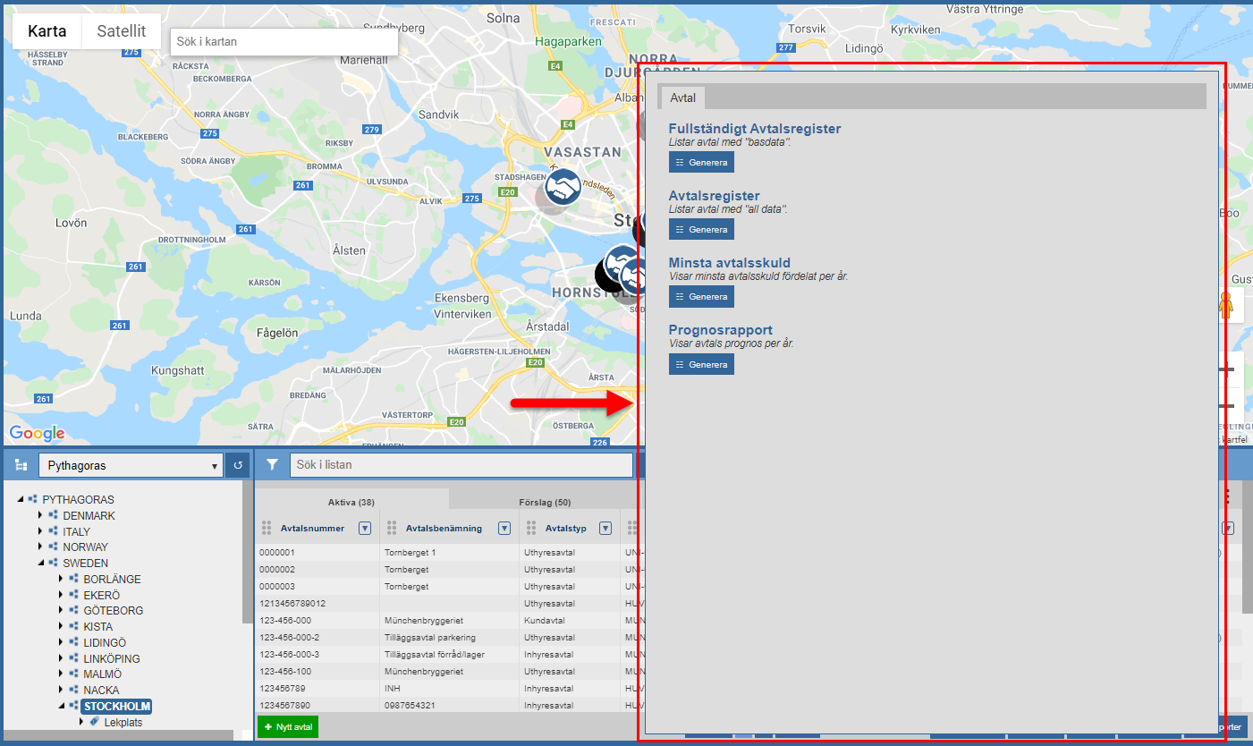 Se till att de avtal du vill inkludera i din rapport är tillgängliga i objektslistan. Detta genom att filtrera fram avtal i denna. För att filtrera fram avtal i objektslistan kan du använda dig av navigationsträdet, göra en fritextsökning eller filtrera i en kolumn. I bilden nedan ser du att vi använde oss av navigationsträdet för att filtrera fram avtal i objektslistan. För mer information om hur du använder dig av navigationsträdet för att filtrera fram avtal i objektslistan, se avsnitt 6.1. För mer information om hur du gör en fritextsökning i objektslistan, se avsnitt 6.4.1. För mer information om hur du filtrerar i en kolumn i objektslistan, se avsnitt 6.4.2.