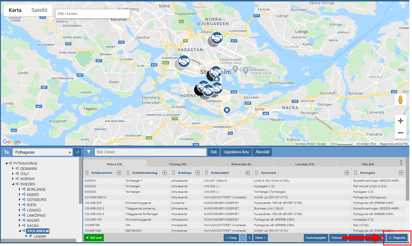Ställ dig på den flik vars innehåll du vill ta ut en rapport på: "Aktiva", "Förslag", "Arkiverade", "Larmade" eller "Alla".