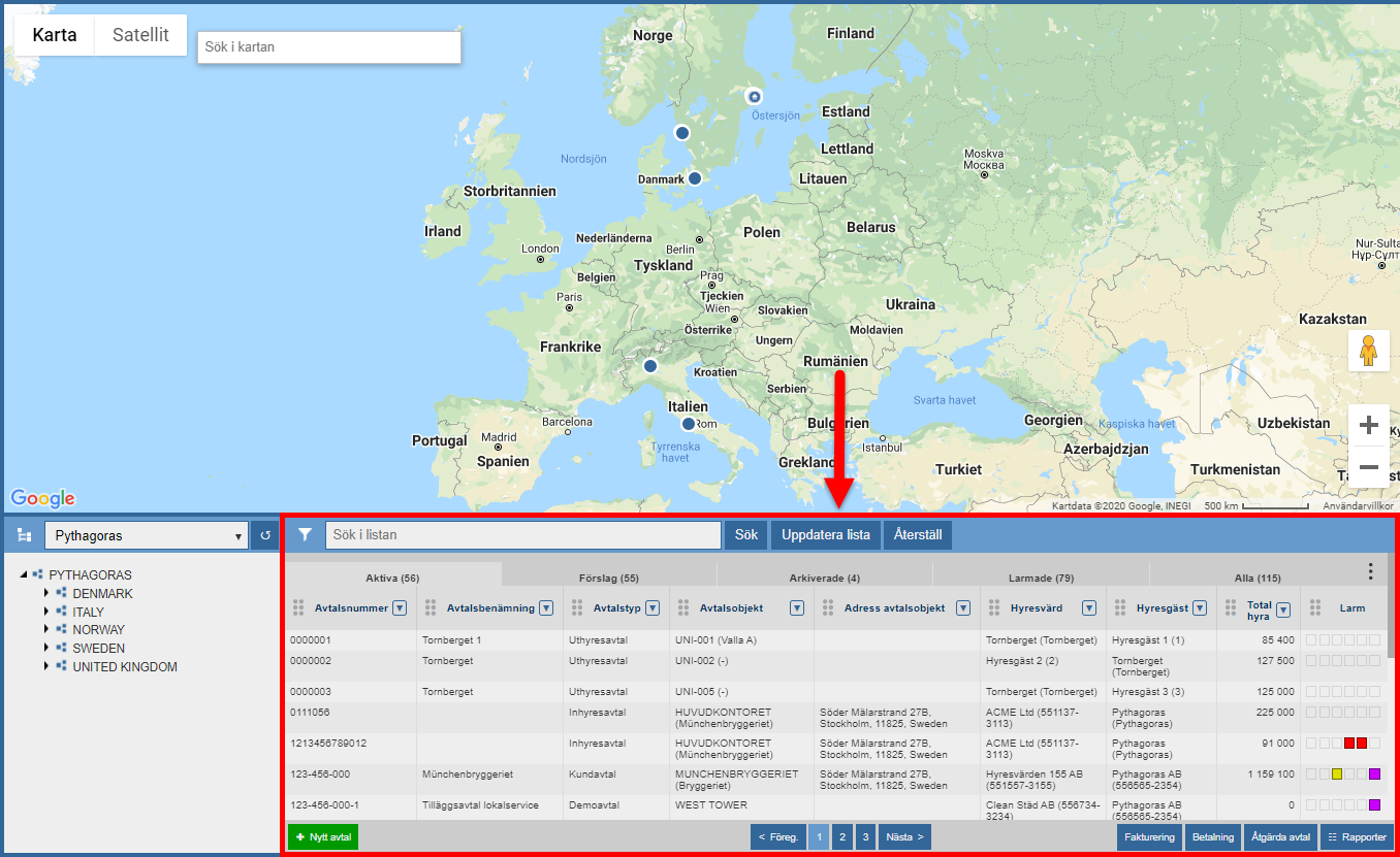 "Area & priser", "Kontering", "Betalningar" eller "Faktureringar", "Dokument", "Signeringar", "Avtalsutskrift", "Larmnotiser", "Händelser" och "Operationer". För mer information om avtalskortet och dess flikar, se kapitel 8. Obs! När du skapar ett avtal skapas avtalet som ett förslag. Ett avtal får inte avtalsstatus förrän avtalets status ändras från "Förslag" till "Avtal".