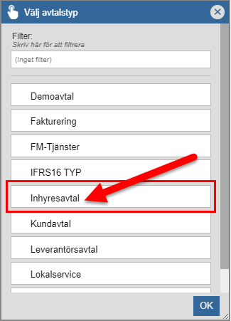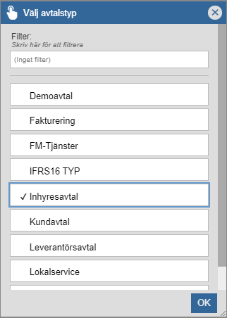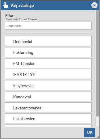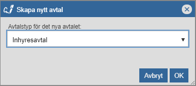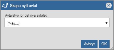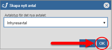 Klicka "OK" i listan med avtalstyper (se den första bilden nedan). När du klickar "OK" i listan med avtalstyper skickas du tillbaka till dialogrutan med namnet "Skapa nytt avtal". I dialogrutan med namnet "Skapa nytt avtal" ser du vilken typ av avtal du angett att du vill skapa (se den andra bilden nedan).