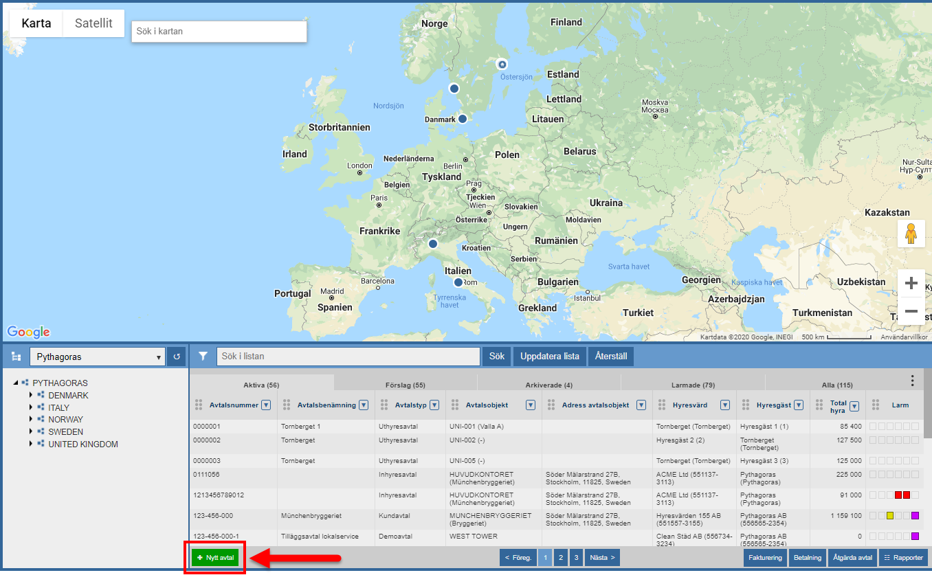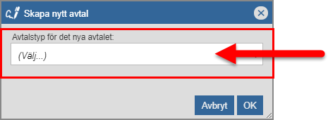 Klicka på knappen med namnet "Nytt avtal" (se den första bilden nedan). När du klickar på knappen med namnet "Nytt avtal" får du tillgång till en dialogruta med namnet "Skapa nytt avtal". I dialogrutan med namnet "Skapa nytt avtal" hittar du ett fält med namnet "Avtalstyp för det nya avtalet" (se den andra bilden nedan).