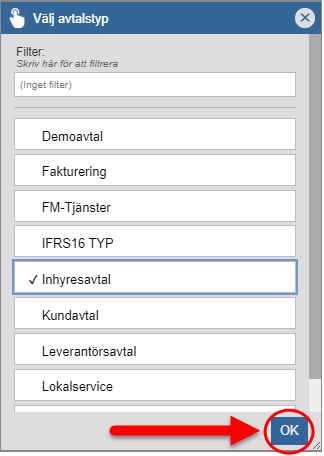 Ange vilken typ av avtal du vill skapa. Detta genom att klicka på en avtalstyp i listan med avtalstyper (se den första bilden nedan). Notera att den avtalstyp du klickar på kommer att väljas och markeras med en bock (se den andra bilden nedan).