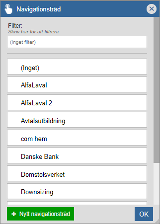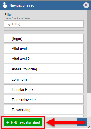 Klicka i det fält du hittar i toppen av navigationsrutan (se den första bilden nedan). När du klickar i det fält du hittar i toppen av navigationsrutan får du tillgång till en lista med navigationsträd. I listan med navigationsträd hittar du en knapp med namnet "Nytt navigationsträd" (se den andra bilden nedan).