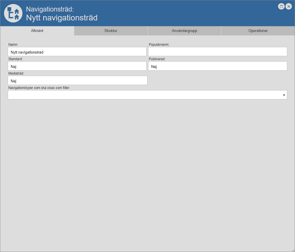 Klicka på knappen med namnet "Nytt navigationsträd" (se den första bilden nedan). När du klickar på knappen med namnet "Nytt navigationsträd" kommer ett nytt navigationsträd att skapas. Samtidigt som ett nytt navigationsträd skapas får du tillgång till navigationsträdets navigationsträdskort (se den andra bilden nedan). I navigationsträdskortet hittar du fyra flikar: "Allmänt", "Struktur", "Användargrupp" och "Operationer".