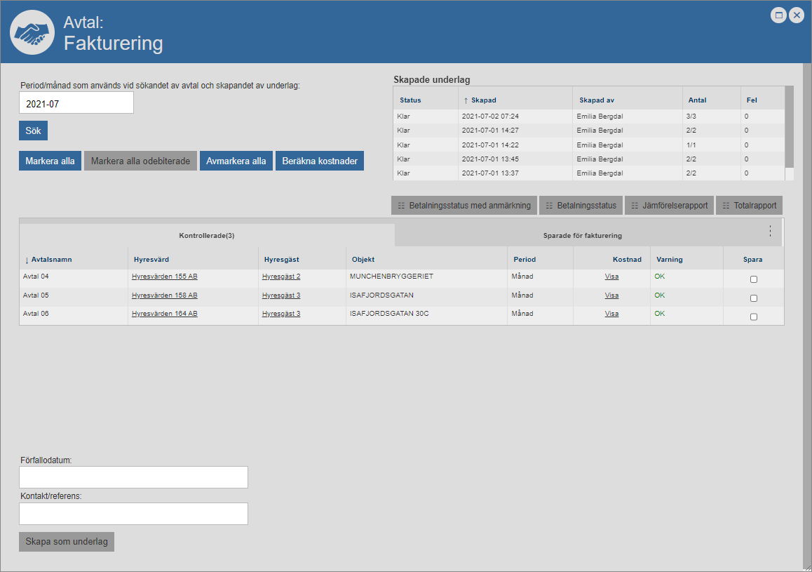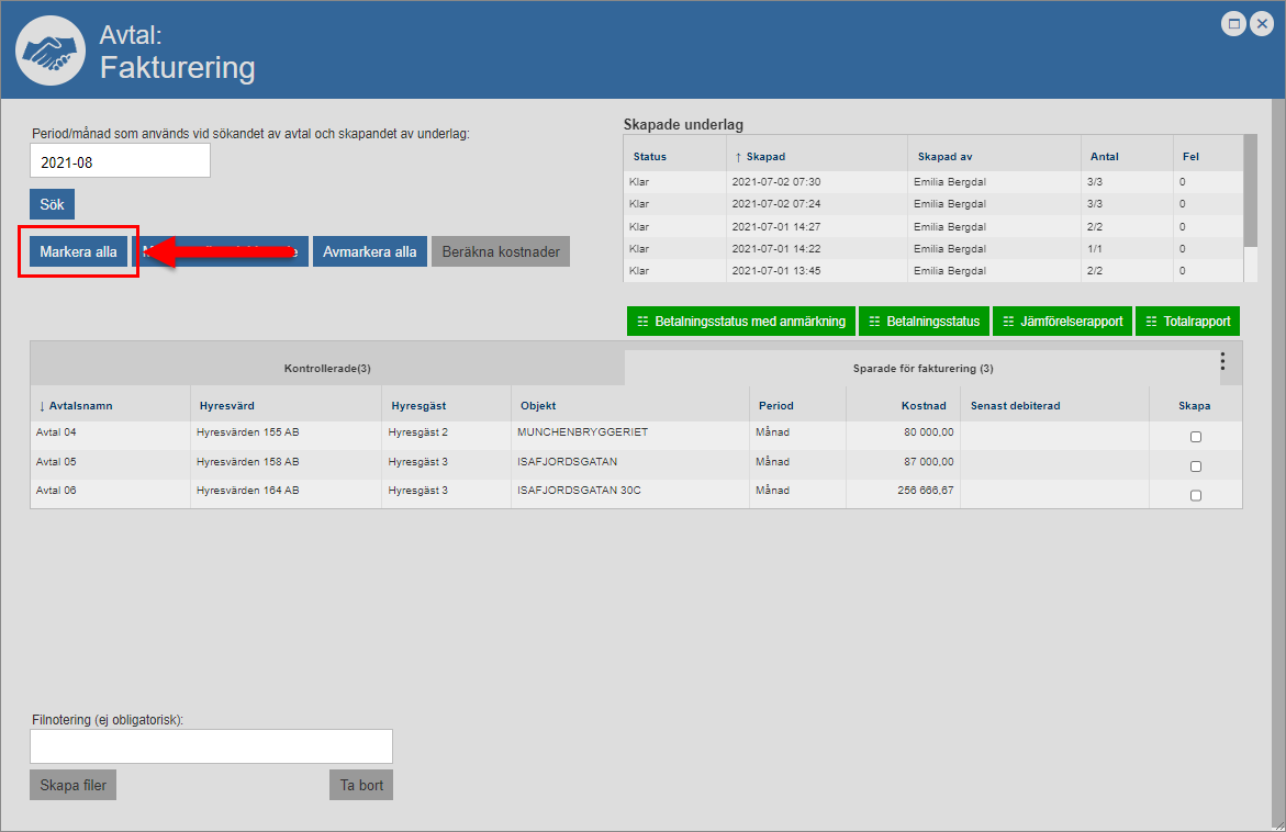 Markera det eller de avtal du vill skapa faktureringsfiler för. Detta genom att bocka för ett eller fler avtal i kolumnen med namnet ”Skapa” eller klicka på knappen med namnet ”Markera alla” (se bilderna nedan). Notera att du, genom att klicka på knappen med namnet ”Markera alla odebiterade”, kan markera alla avtal som inte tidigare fakturerats, det vill säga alla avtal som saknar ett faktureringsdatum i kolumnen med namnet ”Senast debiterad”. Notera också att du, genom att klicka på knappen med namnet ”Avmarkera alla”, kan avmarkera alla avtal du markerat.