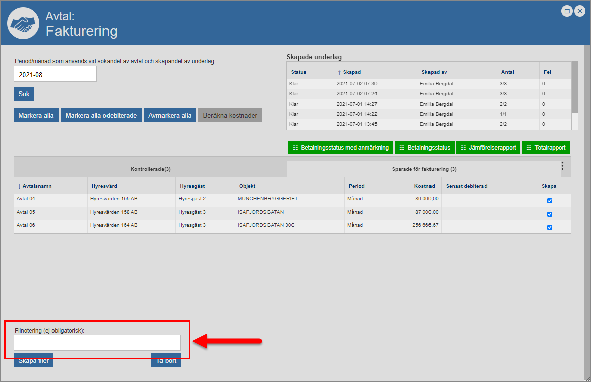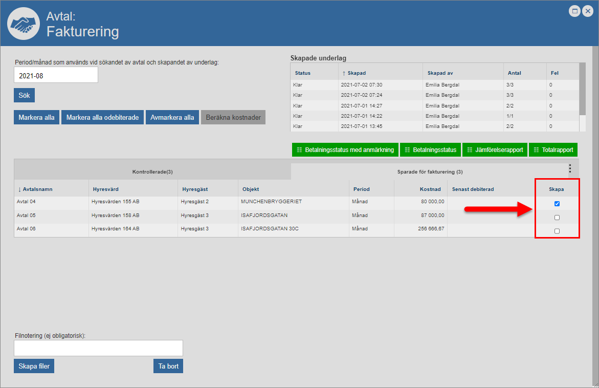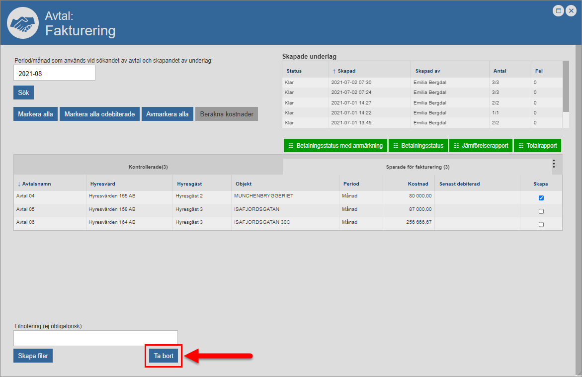 Ta bort det eller de avtal du inte vill skapa faktureringsfiler för från det faktureringsunderlag du arbetar med, det vill säga det faktureringsunderlag som skapats för den period/månad du angett att du vill skapa faktureringsfiler för. Detta genom att bocka för ett eller fler avtal i kolumnen med namnet ”Skapa” och sedan klicka på knappen med namnet ”Ta bort” (se bilderna nedan). När du klickar på knappen med namnet ”Ta bort” kommer det eller de avtal du markerat tas bort från det faktureringsunderlag du arbetar med. När du tar bort ett avtal från ett faktureringsunderlag kommer avtalet flyttas från fliken med namnet ”Sparade för fakturering” till fliken med namnet ”Kontrollerade” i faktureringsfönstrets avtalslista. Obs! Om du inte vill ta bort några avtal från det faktureringsunderlag du arbetar med kan du hoppa över detta instruktionssteg och gå direkt till instruktionssteg 7.