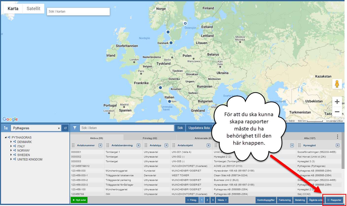 Obs! För att du ska kunna skapa rapporter måste du ha behörighet till objektslistans rapportknapp (se bilden nedan). Om du inte har behörighet till objektslistans rapportknapp kan du inte skapa rapporter när du arbetar i Pythagoras avtal.
