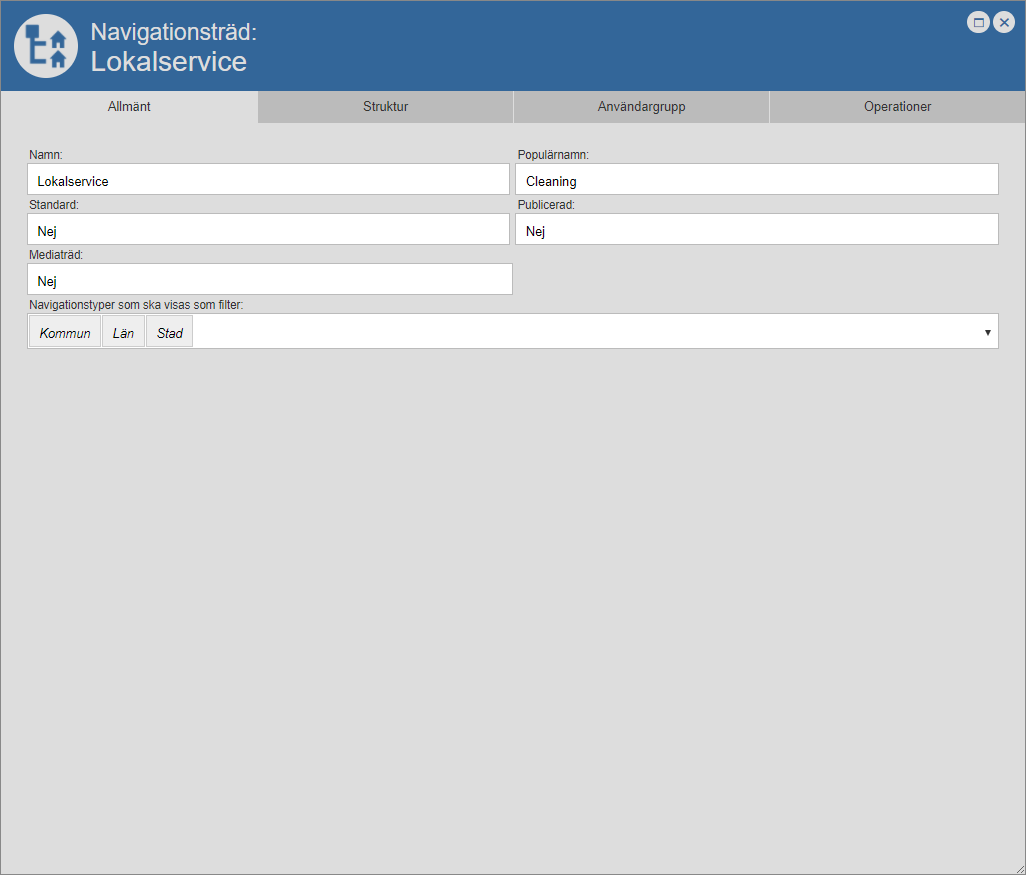 Klicka på "Ta bort" i den dialogruta du fått tillgång till (se bilden nedan). När du klickar på "Ta bort" i den dialogruta du fått tillgåg till kommer det navigationsträd du skapat att tas bort. Obs! När du tar bort ett navigationsträd kommer navigationsträdet tas bort från Pythagoras webb. När du tar bort ett navigationsträd från Pythagoras webb kommer navigationsträdet tas bort för alla användare som har tillgång till det – inte bara för dig.