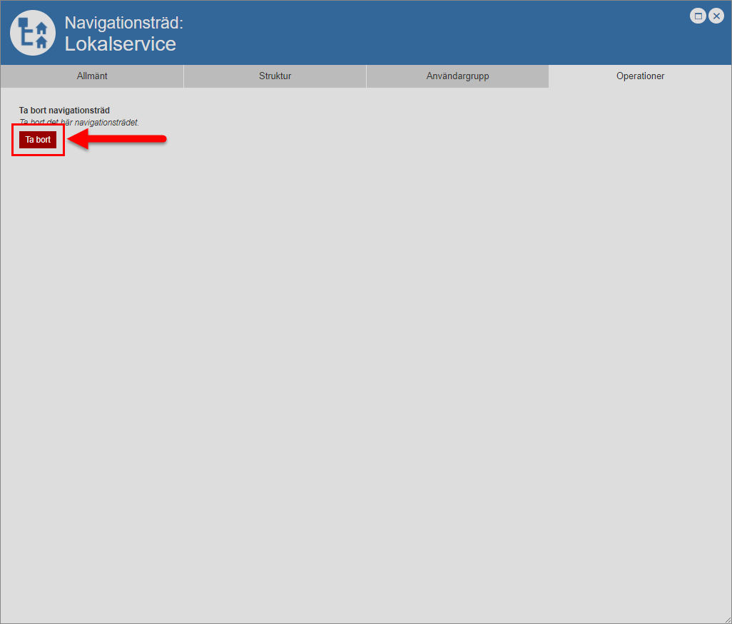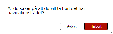 Klicka på knappen med namnet "Ta bort" (se den första bilden nedan). När du klickar på knappen med namnet "Ta bort" får du tillgång till en dialogruta. Via den dialogruta du får tillgång till får du följande fråga: "Är du säker på att du vill ta bort det här navigationsträdet?" (se den andra bilden nedan).