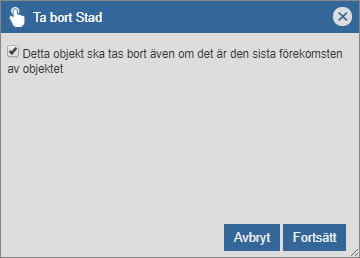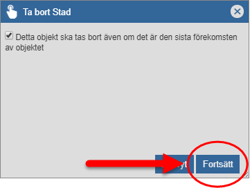 Klicka på "Fortsätt" i den dialogruta du fått tillgång till (se den första bilden nedan). När du klickar på "Fortsätt" i den dialogruta du fått tillgång till kommer den navigationsmapp vars Ta bort-knapp du klickat på, tas bort från det navigationsträd du arbetar med. Obs! Om det finns underliggande mappar och/eller byggnader i den navigationsmapp du tar bort från ett navigationsträd kommer även de underliggande mapparna och/eller byggnaderna tas bort från navigationsträdet. Notera att byggnader som tas bort från ett navigationsträd inte tas bort från Pythagoras webb utan flyttas till en lista med oplacerade byggnader (se den andra bilden nedan).