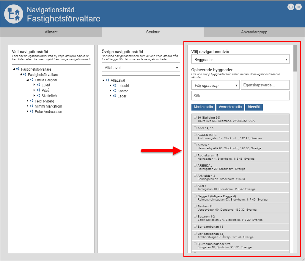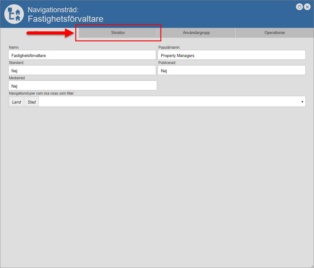Ställ dig på fliken med namnet "Struktur" (se den första bilden nedan). Detta om du inte redan står på den aktuella fliken. När du ställer dig på fliken med namnet "Struktur" får du tillgång till tre kolumner: "Valt navigationsträd", "Övriga navigationsträd" och "Välj navigationsnivå" (se den andra bilden nedan).