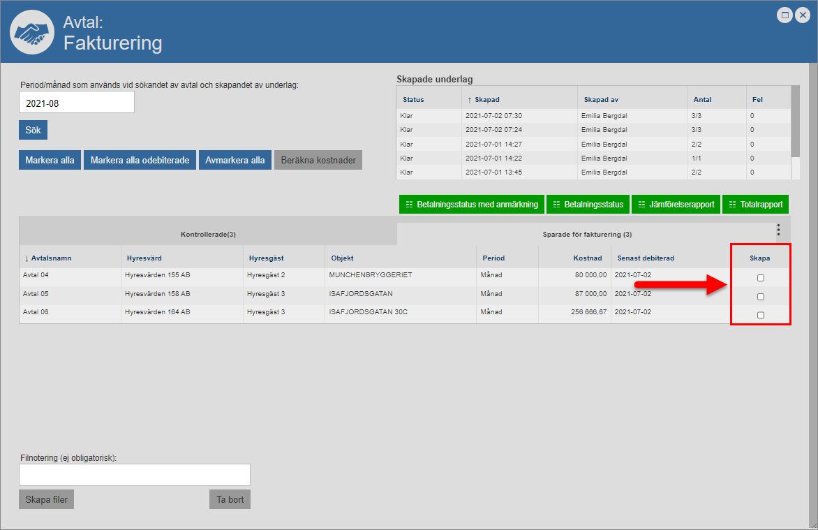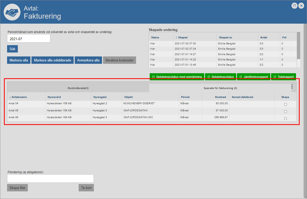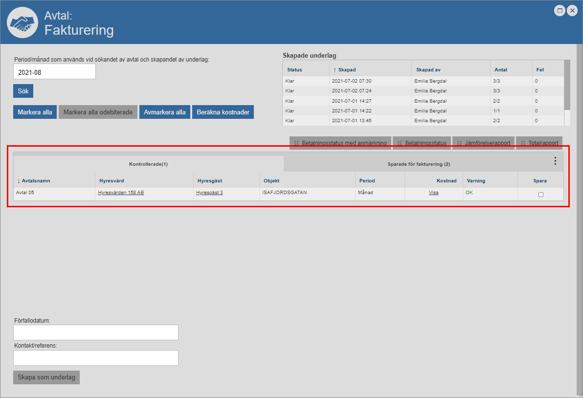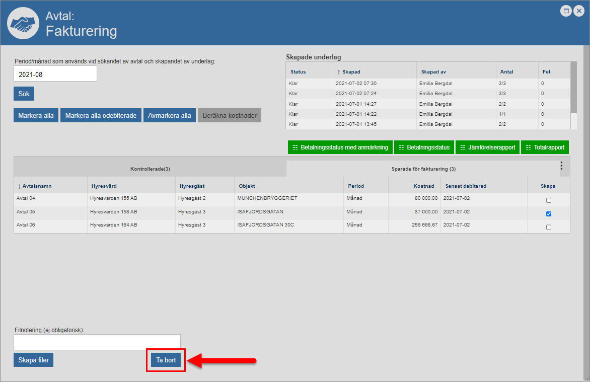 Klicka på knappen med namnet ”Ta bort” (se den första bilden nedan). När du klickar på knappen med namnet ”Ta bort” kommer det eller de avtal du markerat tas bort från det faktureringsunderlag du arbetar med. När du tar bort ett avtal från ett faktureringsunderlag kommer avtalet flyttas från fliken med namnet ”Sparade för fakturering” till fliken med namnet ”Kontrollerade” i faktureringsfönstrets avtalslista (se den andra bilden nedan).