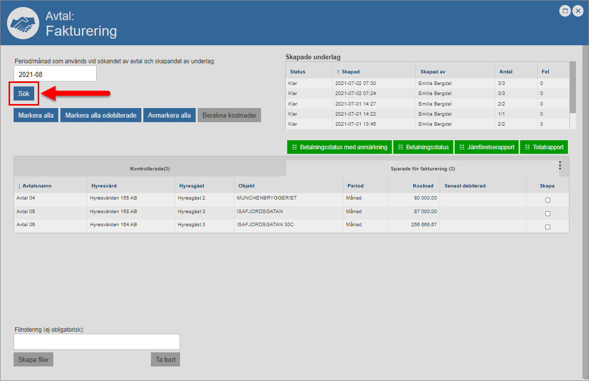 Klicka på knappen med namnet ”Sök” (se den första bilden nedan). När du klickar på knappen med namnet ”Sök” kommer det eller de avtal som kan faktureras under den period/månad du angett att du vill ta bort ett eller fler avtal från att filtreras fram i faktureringsfönstrets avtalslista (se den andra bilden nedan).