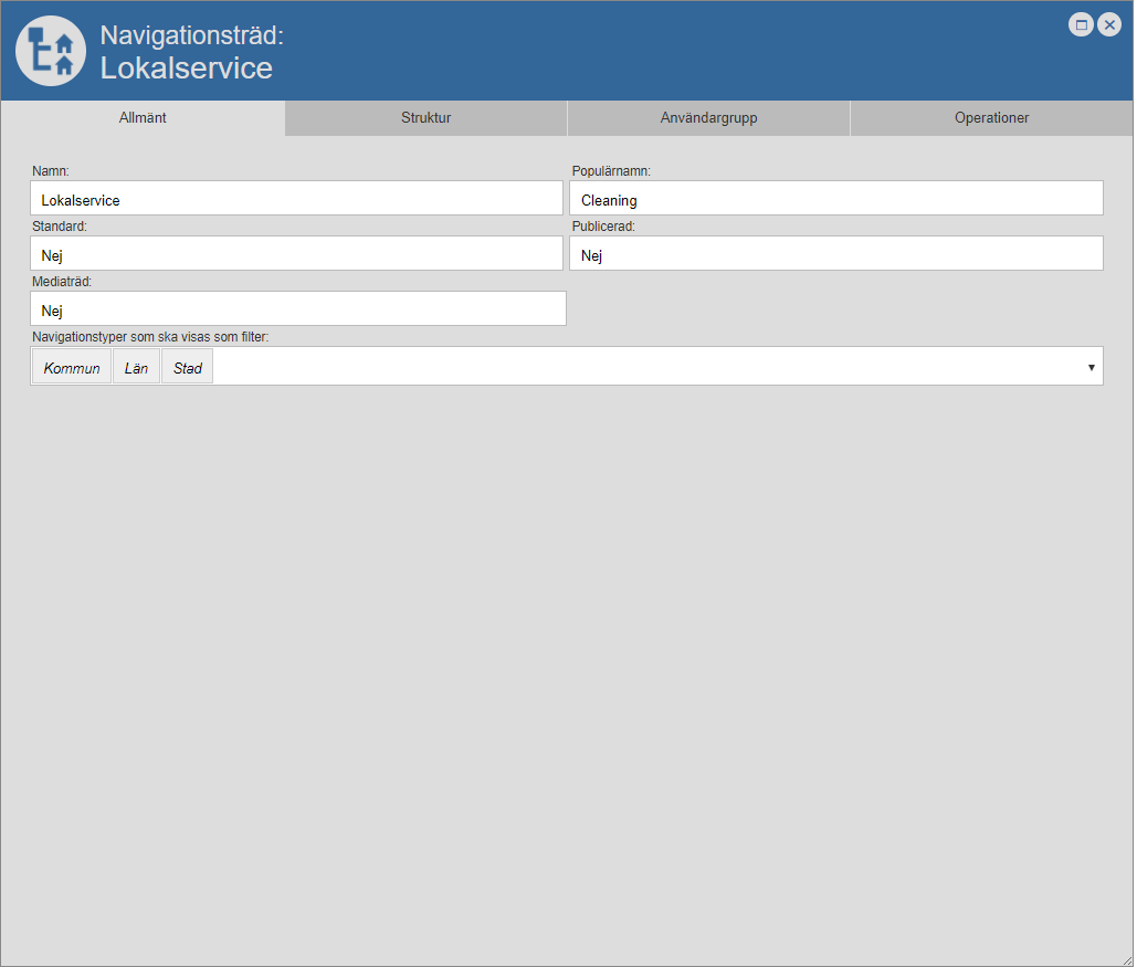 Öppna det navigationsträd du vill ta bort från Pythagoras webb. När du öppnar ett navigationsträd får du tillgång till navigationsträdets navigationsträdskort. I navigationsträdskortet hittar du fyra flikar: "Allmänt", "Struktur", "Användargrupp" och "Operationer" (se bilden nedan). För mer information om hur du öppnar ett navigationsträd, se avsnitt 5.6.