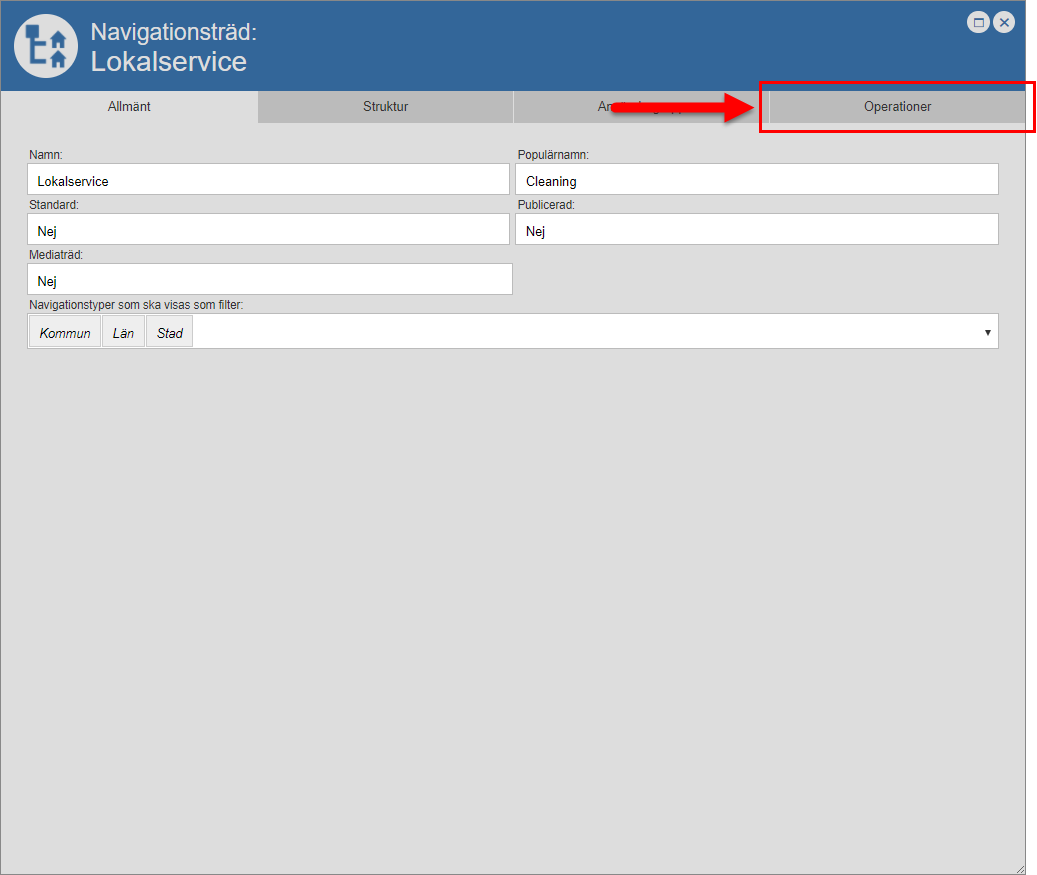 Öppna det navigationsträd du vill ta bort från Pythagoras webb. När du öppnar ett navigationsträd får du tillgång till navigationsträdets navigationsträdskort. I navigationsträdskortet hittar du fyra flikar: "Allmänt", "Struktur", "Användargrupp" och "Operationer" (se bilden nedan). För mer information om hur du öppnar ett navigationsträd, se avsnitt 5.5.