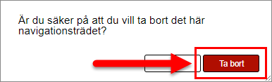 Klicka på knappen med namnet "Ta bort" (se den första bilden nedan). När du klickar på knappen med namnet "Ta bort" får du tillgån till en dialogruta. Via den dialogruta du får tillgång till får du följande fråga: "Är du säker på att du vill ta bort det här navigationsträdet?" (se den andra bilden nedan).